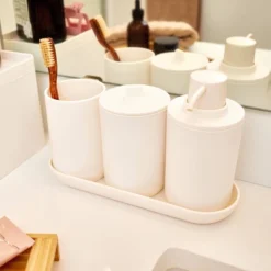 The 4-Piece Bathroom Accessory Set from The Cade Collection by iDesign is the perfect organization piece. This bathroom storage set includes a refillable soap dispenser with pump, toothbrush holder, canister, and tray. The iDesign bathroom organizer has a coconut finish to bring a cohesive look to your bathroom decor. The soap dispenser pump and refillable container can hold up to 12 ounces of your favorite liquid soap or lotion. The plastic toothbrush holder can hold up to 4 toothbrushes for your convenience. Use the canister for storing Q-tips, cotton balls, hair supplies, tweezers, razors, makeup brushes, extra toothbrushes, and more. The included canister lid ensures all items stay clean and dust-free. The oval tray can be used for holding smaller items, such as hair accessories or jewelry, or to keep the other items of this set together. The tray measures 9.75″ x 4.125″ x 6.5″, the perfect compact size for your bathroom or vanity countertop. Crafted from 100% post-consumer recycled plastic, this bathroom sink storage is built to last. Plus, it’s dishwasher-safe (top-rack) so it’s easy to care for. With iDesign, you can live simply every day.