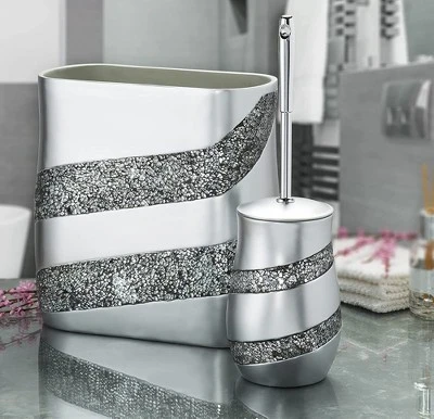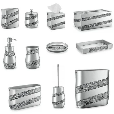 GIVE YOUR BATHROOM AN IMPRESSIVELY EXQUISITE TOUCHElegance in ActionWhether your bathroom has a contemporary look, a rustic feel, or more of a traditional décor, our Silver Mosaicbath accessories complement it with color, shape, and detailing that adds an instant splash of class. You’ll lovethe rich silver-gray look that blends into any color scheme, the soothing gentle curves, and the crackled glassdetailing that creates exquisite drama and eye-catching dance of light. Collect the bath accessories piece bypiece to end up with a bathroom that is not only functional but an elegant sight to behold.All about QualityUnlike metal that easily rusts or regular plastic that quickly cracks, these bath accessories are made using a high-graderesin that ensures maximum durability. All through the daily use and humid conditions of your bathroom, these beautifulpieces will remain in eye-catching condition for years to come. And we’ve carefully sized each accessory to ensure itsaves on valuable space while still exuding a captivating presence. Experience a hard-to-find marriage between superiorquality and great functionality.Here’s why you’ll love the Silver Mosaic collection:- Made using high-grade resin to ensure maximum durability.- Beautiful curves create a timeless look to suit any bath.- The silver-gray hue beautifully blends into any color scheme.- Perfectly sized to fit even tight-spaced bathrooms.- Unique design makes it a great gift for both men and women.