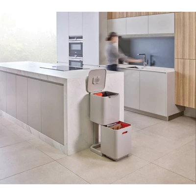 Totem is an award-winning design that combines all your waste and recycling in one compact unit. It features two compartments arranged vertically, which saves space and makes them very easy to fill and empty. Each compartment has a removable bucket that can be fitted with a single standard liner for general waste or two smaller bags, using the integrated bag hooks, for separating different types of recycling. Breather vents in the bucket sides make removing a full liner easier. Totem also features a ventilated odor filter in the main lid that helps reduce moisture and odor build up from waste. The design comes with a 3-litre (0.8 US Gallon) removable food waste caddy that can be stored in either compartment, or on the worktop. Stylish, practical and durable, Totem is available in two sizes – Totem Max (60 litres/15.8 US Gallons) and Totem Compact (40 litres/10.5 US Gallons). Custom-fit liners for the main compartments and compostable liners for the food waste caddy are available separately, as are replaceable odor filters. Stainless-steel versions feature a fingerprint-proof coating, whilst other models feature an easy-clean powder-coated steel finish. Choose the right custom-fit liner: IW2 and IW7.