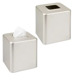 Dress up boring, square tissue boxes, while adding a decorative touch to your bathroom vanity with the Tissue Box Cover from mDesign. Fits over standard-sized tissue boxes and the open bottom making refilling easy. The opening in the top is large enough to make grabbing tissues easy while still hiding colored cardboard tissue boxes. The modern design adds a decorative touch to your decor.