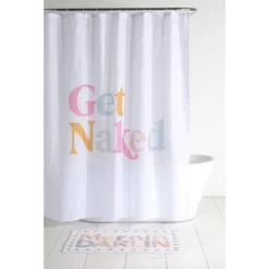 Bring a chic style and funcionality to your bathroom with Shiraleah’s “Get Naked” shower curtain. Use it to accessorize any bathroom in your home. This shower curtain features a clean white backdrop with “Get Naked” in a block font. MeasuringL 72″ X W 72 will fit standard shorwers. Comes with button holes ready for installation. Hooks and liner are not included. Pair with other items from the Shiraleah home collection to complete your look!