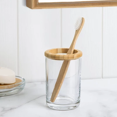 - Refreshing classic shaped glass toothbrush holder with bamboo accents brings a clean and natural feeling to your bathroom
