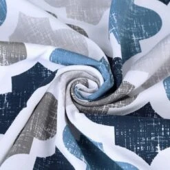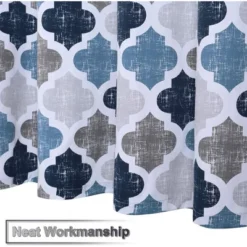 1. 75% Polyester/25% Cotton Blend Thick Fabric at 170gsm With Quatrefoil Trellis Print. 2. Superior Quality: Made of cotton blend fabric, Wrinkle resistant, Lint and snag resistant, Holds up to daily use and colors will remain vibrant through years of washing. Not waterproof, use of liner recommended for added protection. 3. Chic Geometric Design: The Moroccan print is featured in white against a decorative striped background of muted tones for beautiful contrast. It adds sophistication to your bathroom. 4. Serve Well: 170 GSM (gram per square meter) Heavy-weight woven fabric construction prevents the curtain from billowing; Drapes beautifully for a clean, fresh look in your bathroom. 5. Simple Installation: Reinforced top header with durable buttonhole construction make these curtains easy to hang up, and various lengths are sure to fit most bathtubs and showers. (12 curtain hooks not included) 6. Easy Care: Machine washable in cold water, gentle cycle, tumble dry low, cool iron if needed.