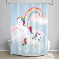 Add a magical touch to your little one’s bathroom with the Unicorn and Rainbow Shower Curtain by Allure Home Creation. This enchanting design, in colorful shades of the rainbow, features mythical unicorns gently floating on puffy clouds of white and pink. The star filled sky blue backdrop is highlighted with a brillianr curved rainbow. This fairy-tale design is sure to spark your child’s imagination and make their bath time routine more fun. This printed shower curtain measures 70″ x 72″ and fits most standard sized tubs and shower areas providing privacy and protection from water splashing onto the floor. Crafted from 100% easy care polyester taffeta fabric with a reinforced buttonhole top that works well with standard shower hooks and curtain rods. Use of a liner is recommended. Machine wash and tumble dry on low heat. Complete the look with the coordinating Unicorn and Rainbow Bath Accessories.